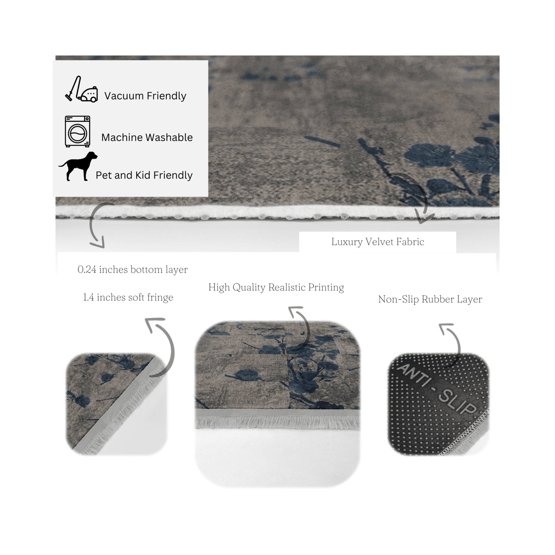• Machine-Washable floor rug• Produced with 3D Digital Printing technology in BSCI certified facilities using the latest technology.• Made of cotton and polyester mix fabric.• Has 0.24 inches non-slip woven base. Total thickness of carpet is 0.32 inches• These rugs have fringes. Has 1.5 inches fringes on the short sides of these rectangular rugs and on the two edges of the square• Do not fade due to washing and use. Can be washed at max. 30 C , Do not collect lint and stain-resistant.• Suitable for machine washing . Anti-allergic soft cotton based material.  Suitable for daily use .• Have international certificate OEKO-TEX® -Standard 100.• Do not contain any chemicals harmful to human and animal health. Have no carcinogenic effect